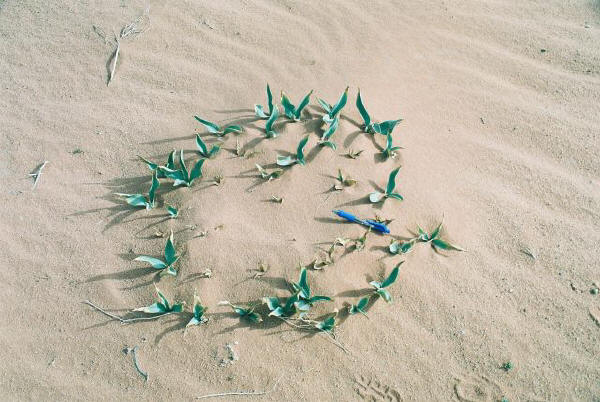 My name is Hezi Yizhaq and I'm a physicist in the Blaustien Institute for Desert Research located in the Negev at Southern Israel. I saw many rings of plants (attached few pics), although they are very small compare to the Creosote rings. I investigate this phenomenon with a mathematical model. According to our view the ring formation mechanism is as follows: An initial small spot of biomass starts to grow and expands outside. As the spot diameter grows the biomass in the center of the spot suffers form water stress because of intensive competition on water. Consequently central die-back of individuals that result in ring formation may be an effective way to use the limited amounts of water by the whole genet and maintain higher total biomass than if the same amount of water were homogeneously distributed. I attaches an animation (numerical simulation) which shows this process with 220 mm/y with 4 rainy months. I read in your webpage that you " wonder if the occurrence of the Creosote rings are in direct relationship to the lack of moisture in the area or the elements in the soil or a combination of the two". What do think about our idea? With parameters values which relate to Creosote, I can try to model the rings formation of this peculiar plant.
