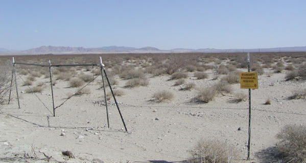 | From Lucerne Valley travel 13.3 miles east of the 4-way stop at the intersection of Old Woman Springs Road (Highway 247) and State Hwy 18 towards Landers / Johnson Valley. Head North at Bessimer Mine Road turnoff from Old Woman Springs Road. It is a rough, graded dirt road. .6 miles (6/10) from the pavement is the start of the fenced protected area located on the east side of Bessimer Mine Road. |
