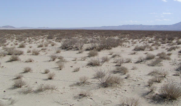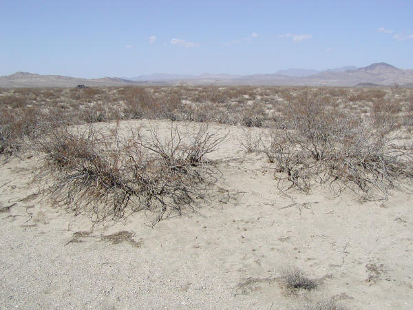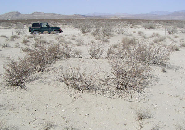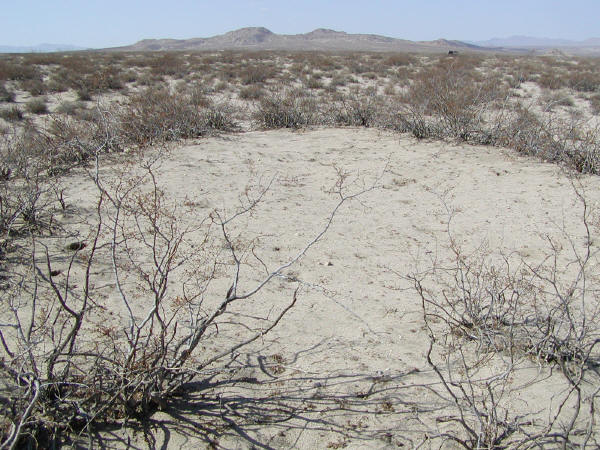 | 1.3 miles (1-3/10) from the pavement you can see a few of the smaller rings. In this picture two rings are shown. One is very close to the road. These rings have some open spaces between the bushes. The winds have moved sand around these bushes creating a raised mound. |