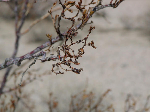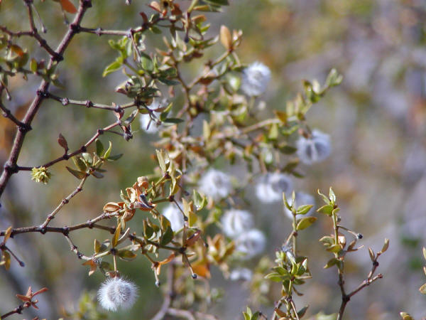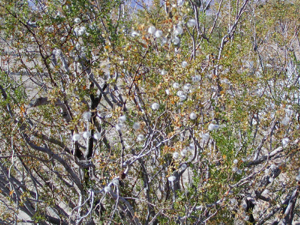 | Here you can see the fruit or seeds of the Creosote bush. This bush appears to receive abundant moisture. |